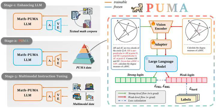 Multimodal Large Language Models (MLLMs) excel in solving text-based mathematical problems, but they struggle with mathematical diagrams since they are primarily trained on natural scene images. For humans, visual aids generally enhance problem-solving, but MLLMs perform worse as information shifts from textual to visual modality. This decline is mainly due to their shortcomings in aligning images and text. To tackle aforementioned challenges, we propose Math-PUMA, a methodology focused on Progressive Upward Multimodal Alignment. This approach is designed to improve the mathematical reasoning skills of MLLMs through a three-stage training process, with the second stage being the critical alignment stage. We first enhance the language model’s mathematical reasoning capabilities with extensive set of textual mathematical problems. We then construct a multimodal dataset with varying degrees of textual and visual information, creating data pairs by presenting each problem in at least two forms. By leveraging the Kullback-Leibler (KL) divergence of next-token prediction distributions to align visual and textual modalities, consistent problem-solving abilities are ensured. Finally, we utilize multimodal instruction tuning for MLLMs with high-quality multimodal data. Experimental results on multiple mathematical reasoning benchmarks demonstrate that the MLLMs trained with Math-PUMA surpass most open-source MLLMs. Our approach effectively narrows the performance gap for problems presented in different modalities.