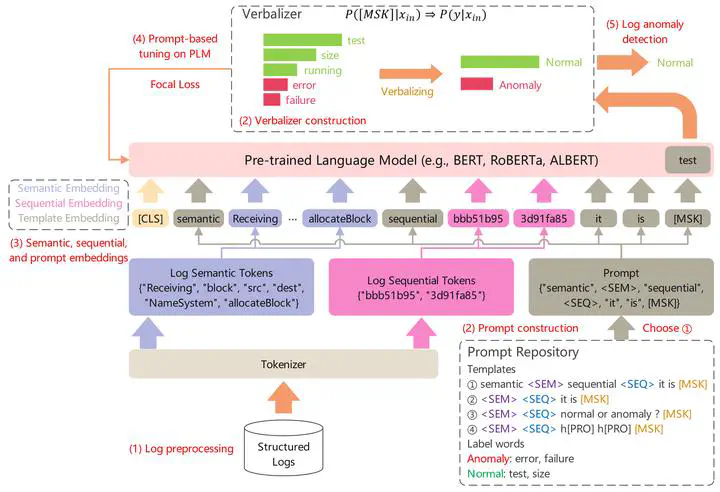 Log data are widely used in anomaly detection tasks of software system. At present, log anomaly detection methods based on deep learning have greatly progressed. However, the existing methods have the following limitations: (1) Logs are at large scale but labeled logs are rare, so training a detection model that requires a number of labeled log data from scratch is costly and impractical; (2) Log anomaly detection tasks usually need to comprehensively consider the semantic and sequential information in logs, but most of the current log anomaly detection frameworks only build models from either aspect; (3) Normal and abnormal logs are imbalanced in real world, which seriously reduces the detection recalls. This paper proposes a log anomaly detection framework called LogPrompt to solve the problems mentioned above. LogPrompt leverages prompts to guide the pretrained language model (PLM) to better learn the semantic and sequential information of logs, and avoids training a model from scratch. Even with few training data, the model achieves good detection performance. Moreover, it uses focal loss instead of cross entropy loss to guide the model optimization during training stage, for alleviating the class imbalance problem. Experiments show that LogPrompt can detect log anomalies more effectively and efficiently by prompts, and it can significantly improve the recalls and F1 scores.